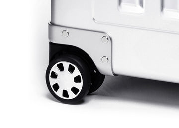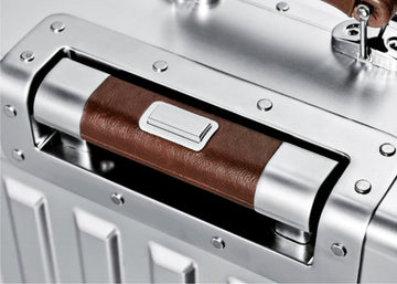 The trolley handle retracts into a die-cast aluminum housing, one of the most unique features of the case, typically made from plastic by other luggage manufacturers.