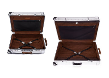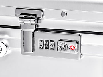 The top lid can be secured to the trunk with a TSA-approved, double spring-loaded combination latch lock system, flanking the leather side handle of the case on each side.