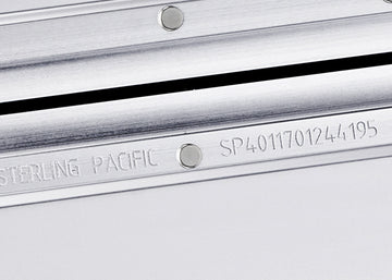 Every authentic Sterling Pacific travel case bears a Batch Identification Number, engraved onto the exterior frame and pressed onto the leather logo patch inside each case.